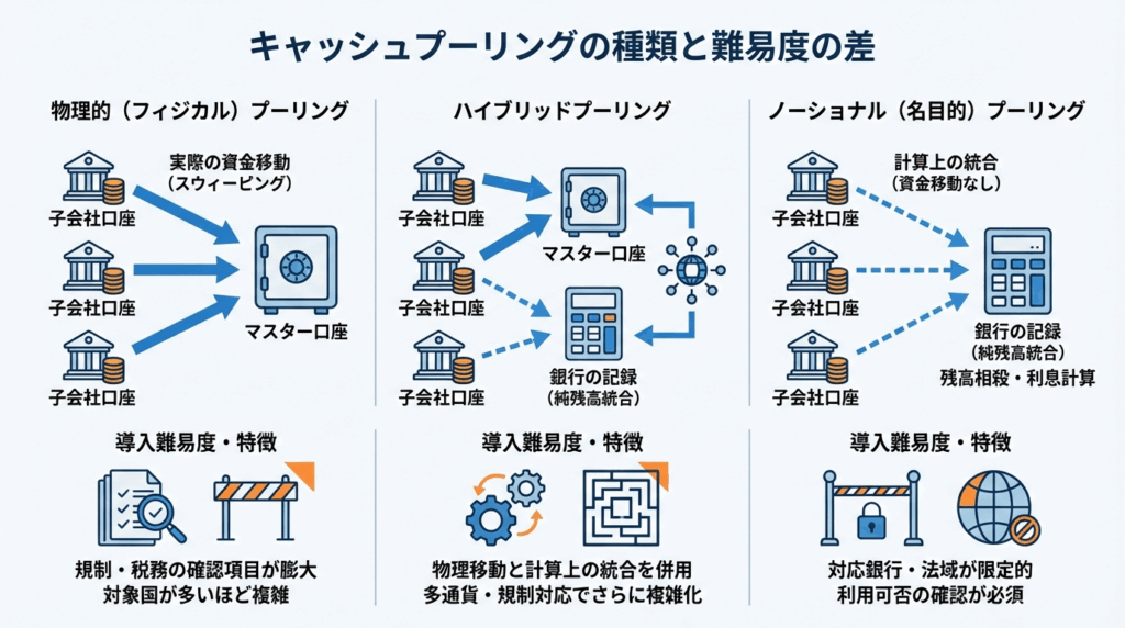 キャッシュプーリングの種類によって、導入の難易度と得られる効果は異なります。物理的プーリングでは子会社の口座から中央のマスター口座へ実際に資金が移動するスウィーピング方式を取ります。一方、ノーショナルプーリングでは現金の実際の移動はなく、口座残高を名目的に相殺し、銀行がプール全体の純ポジションに対して利息を計算します(参照*3)。