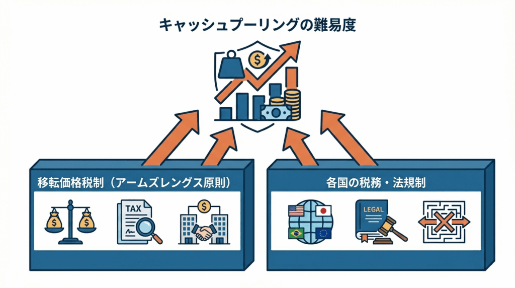 キャッシュプーリングやキャッシュ集約の難易度は、プーリングの種類、対象国の規制、移転価格税制への対応、そしてシステム統合の範囲によって決まります。一律に「難しい」「簡単」とは言い切れないところがこのテーマの特徴です。