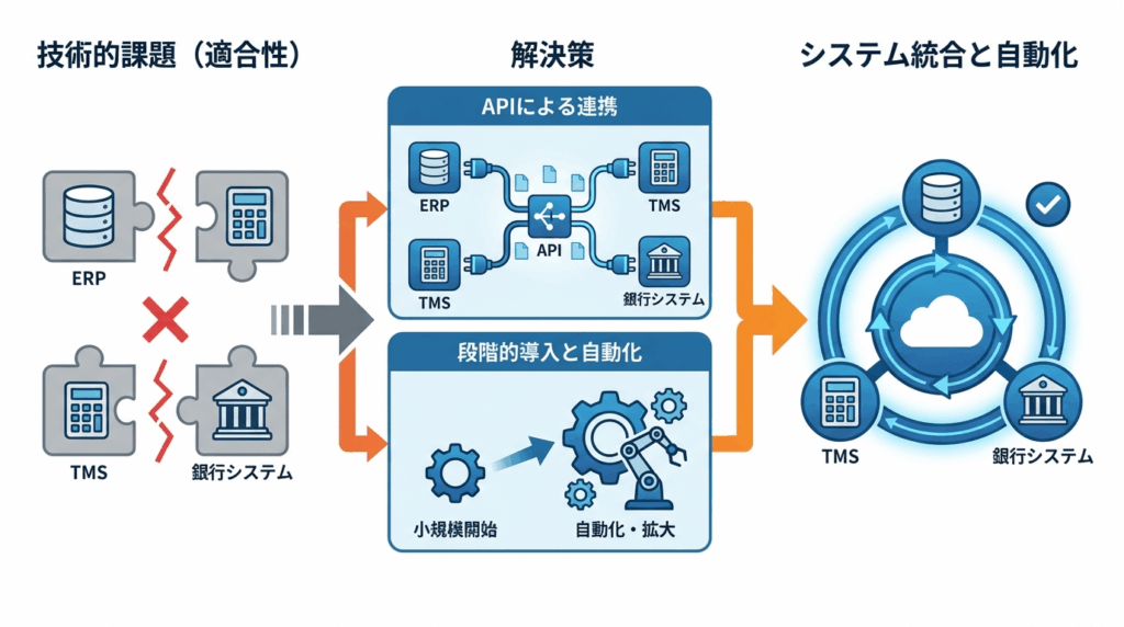 主な課題の一つはシステムの適合性です。ERP(企業の基幹業務を管理するシステム)、財務システム、TMS(財務管理システム)を子会社間で統合することは、データ共有の観点から複雑になりがちです(参照*4)。