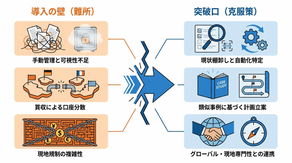 南アフリカの企業Motusの事例も、導入の難易度を物語っています。南アフリカの為替管理規制が国内外の運転資金に非効率を生んでおり、国境を越えた銀行ソリューションが必要でした。Motusは、グローバルな知見と現地の専門性を持つ金融機関との連携が不可欠だったと述べています(参照*11)。買収による口座の急増や現地規制の壁など、自社の状況に近い事例と照らし合わせて導入計画を立てることが実務上有効です。