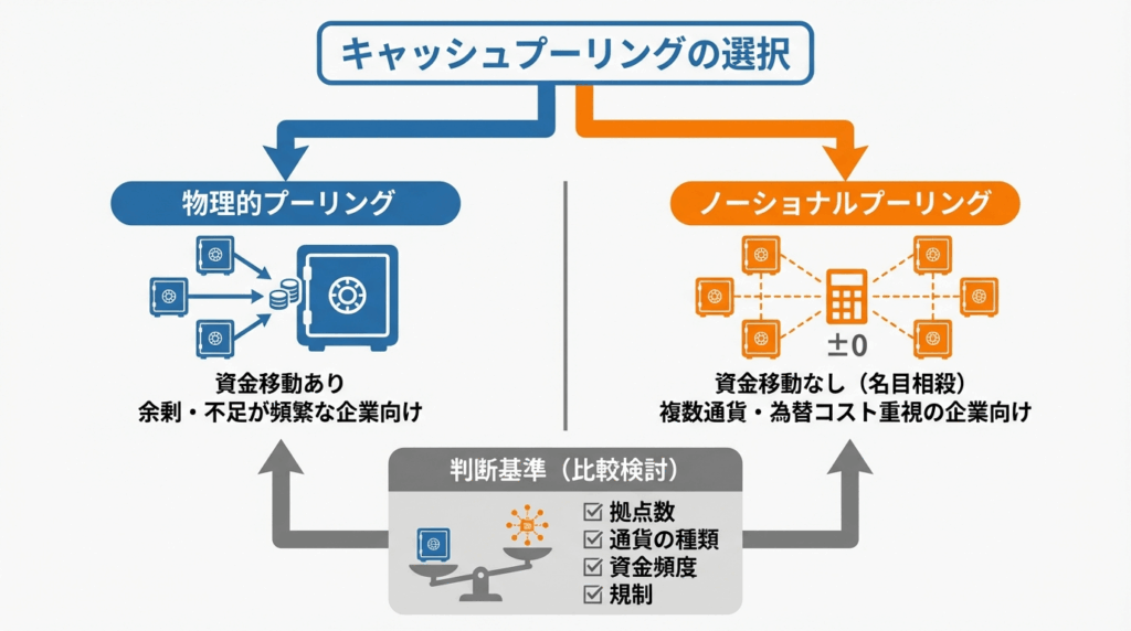 どちらを選ぶかの判断にあたっては、いくつかの観点を整理する必要があります。物理的プーリングは、頻繁に余剰と不足が発生する企業に適しています。ノーショナルプーリングは、複数通貨で事業を展開している企業や為替コストを抑えたい企業に有利です。企業は現金の流れ、規制、税務への影響を評価して構造を選択すべきとされています(参照*4)。